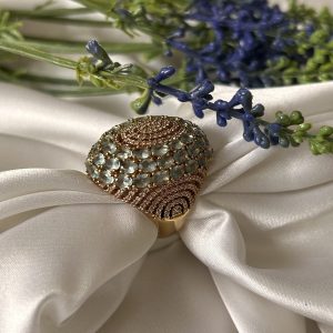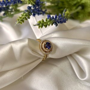 Anel Dourado Cravejado e com Pedra Azul